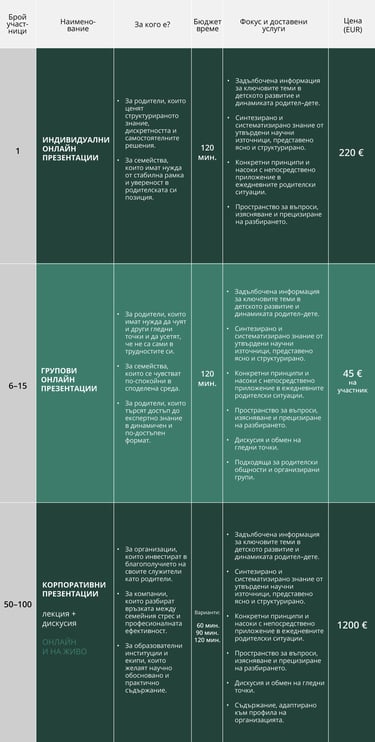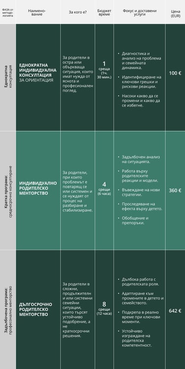 Препоръки за хармонични взаимодействия, обсъждане на особеностите на връзките и конфликтните точки между членовете на семейството.