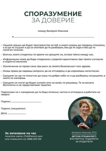 За да се чувства детето Ви спокойно относно конфиденциалността на срещите ни, можете да му предоставите това Споразумение, което ще подпишем заедно.